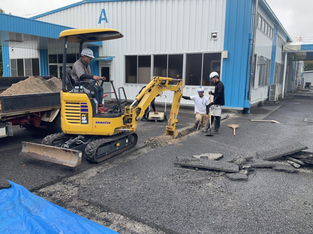 コンクリートのはつり作業、アスファルトの切断作業が完了し、ついに重機による本格的な掘削作業が始まりました!いよいよ現場が大きく動き出します。