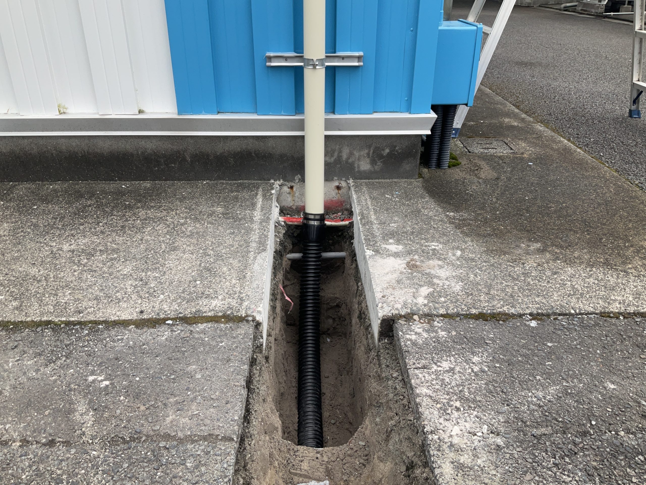 地中に埋める部分には、耐久性に優れた**波付硬質ポリエチレン管(FEP)を使用し、埋設から地上に出る部分には、硬質ビニル電線管を使用し、見た目もきれいに仕上げます。